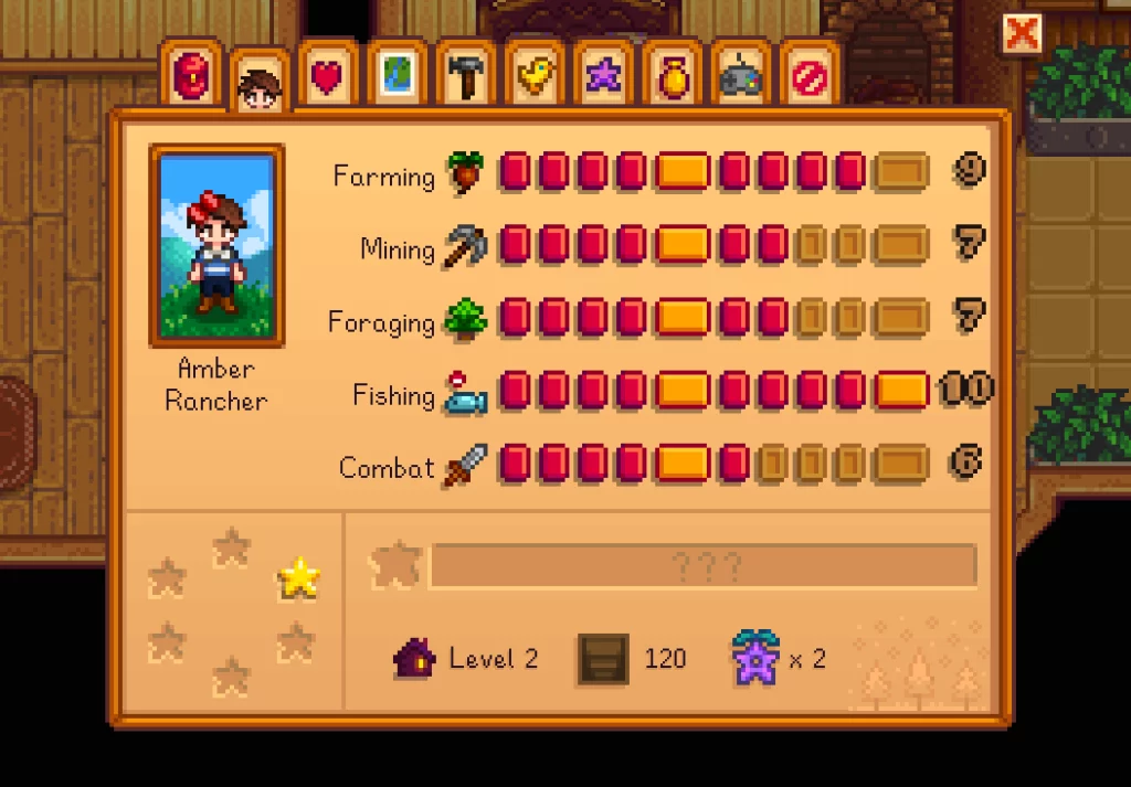 The Skills tab tracks progress in farming, fishing, foraging, combat, and mining, unlocking perks that improve efficiency.
