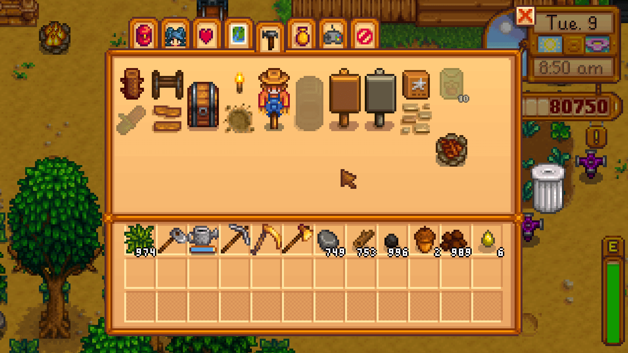The Backpack stores all collected items, crops, tools, and resources. Upgrading it early at Pierre’s General Store is essential for carrying more items while farming, fishing, mining, or exploring.